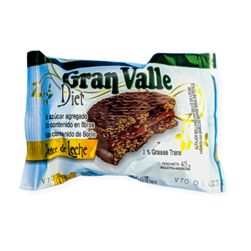 ¡Deléitate con el alfajor Gran Valle relleno de dulce de leche! Cada alfajor está cubierto con un baño de repostería dietético sin azúcar agregado y tiene un alto contenido en fibras y bajo contenido en sodio. La caja contiene 18 unidades de 45g cada una.