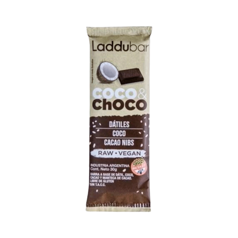 Barra LadduBar de 30g, sabor coco-choco, a base de dátiles, castaña de caju, coco y cacao. Libre de gluten y sin TACC.