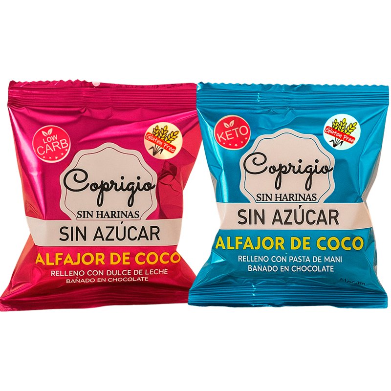 de 12 unidades de alfajores de la marca Coprigio, formulados sin azúcar agregada, elaborados con coco rallado, relleno de pasta de maní o dulce de leche sin azúcar, y sin harinas refinadas de 38g c/u