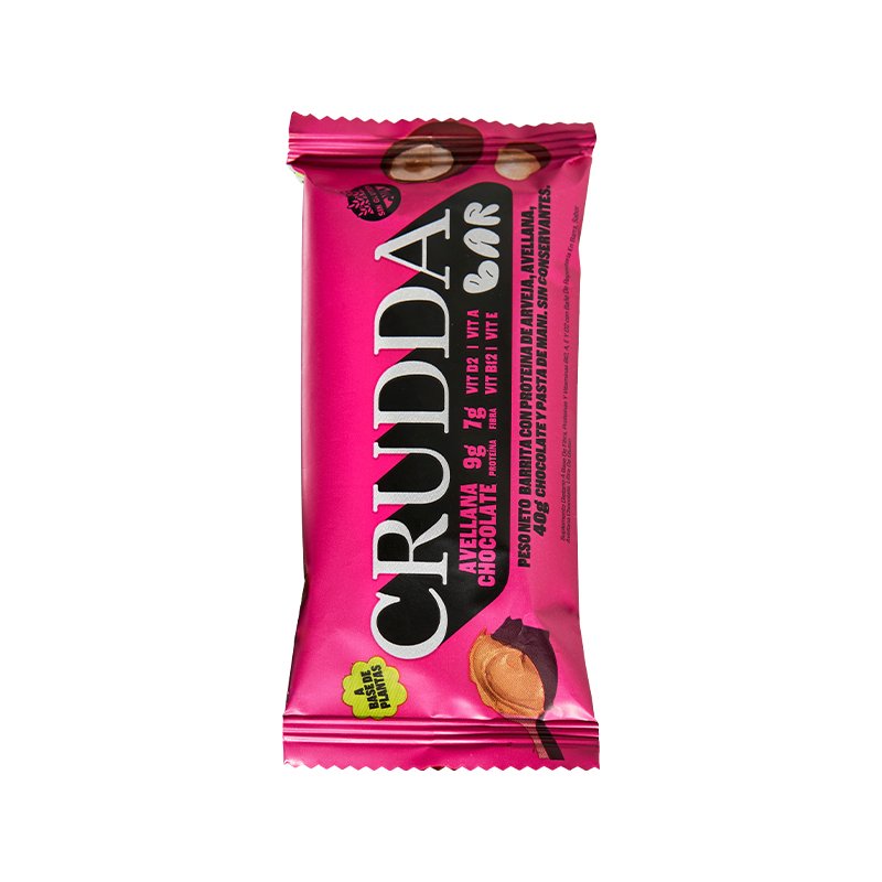 barritas Crudda, sabor avellana y chocolate, vegana y sin tacc Elaborada con proteínas de origen vegetal, avellanas de alta calidad, chocolate semiamargo y pasta de maní x10 unidades