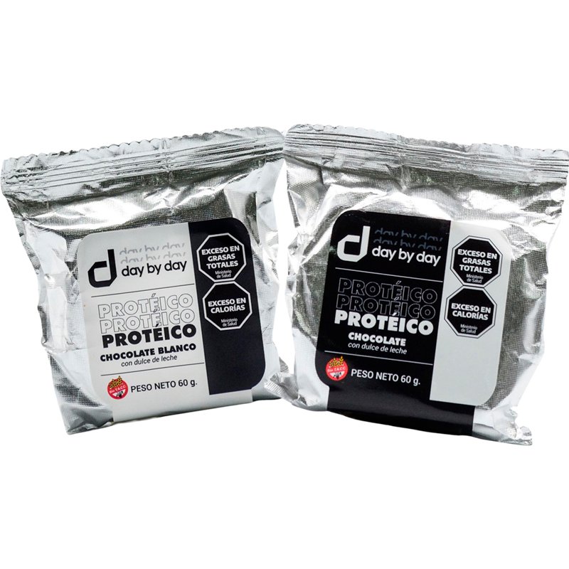 pack de 12 unidades de alfajores proteicos Day by Day. Cada unidad aporta aproximadamente 12 g de proteína, está formulada libre de gluten (Sin TACC) y rellena con dulce de leche proteico o versiones saborizadas, cubierta en chocolate de 60g c/u