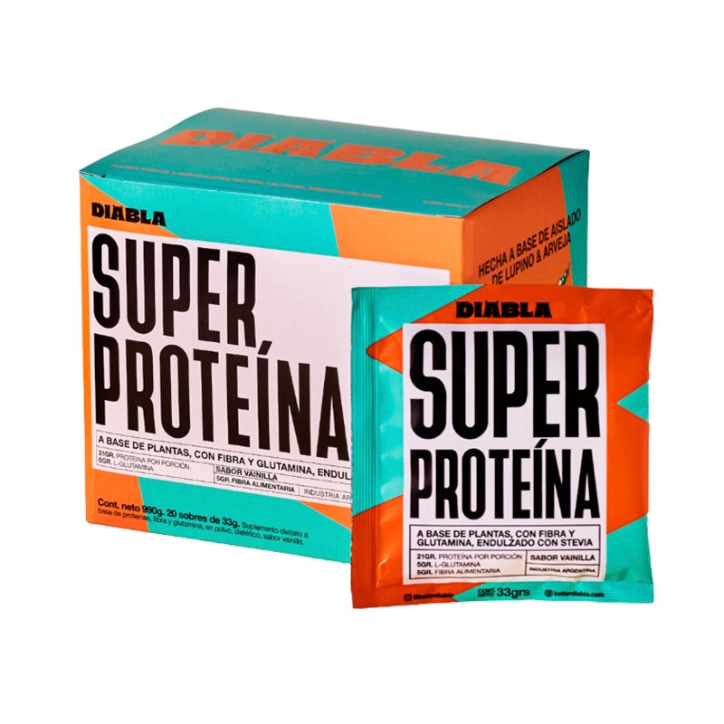 Diabla Super Proteína Vainilla suplemento proteico vegetal premium Cada porción aporta aproximadamente 21 g de proteína, 5 g de glutamina, 0 g de carbohidratos netos y está hecha a base de arveja y lupino. veganas, “keto friendly”, sin soja, sin azúcares añadidas y libre de gluten– Pack x20 sobres