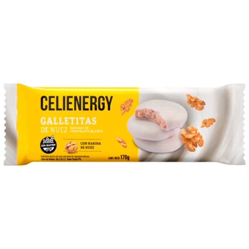 GALLETITA CELIENERGY CON BAÑO CHOCOLATE BLANCO CON NUEZ X170 G. SIN TACC