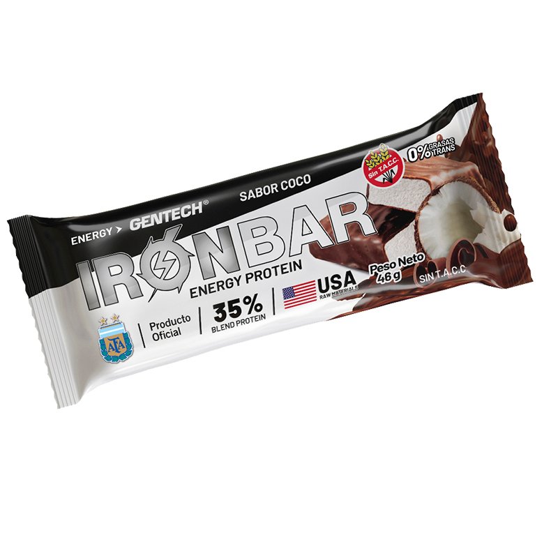 barra proteica IRON BAR AFA sabor coco: diseñada para personas activas que buscan rendimiento y snack funcional. Formulada con proteína de suero lácteo, hidratos de carbono, y el sabor tropical del coco. sin tacc x 20 unidades x 46g