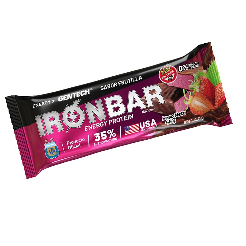 barra proteica de la línea IRON BAR AFA caja contiene 20 unidades sabor frutilla con aporte proteico. Cada unidad (~46 g) y 16 g de proteína vegetal o combinada, es libre de gluten caja x 20 unidades x 46g