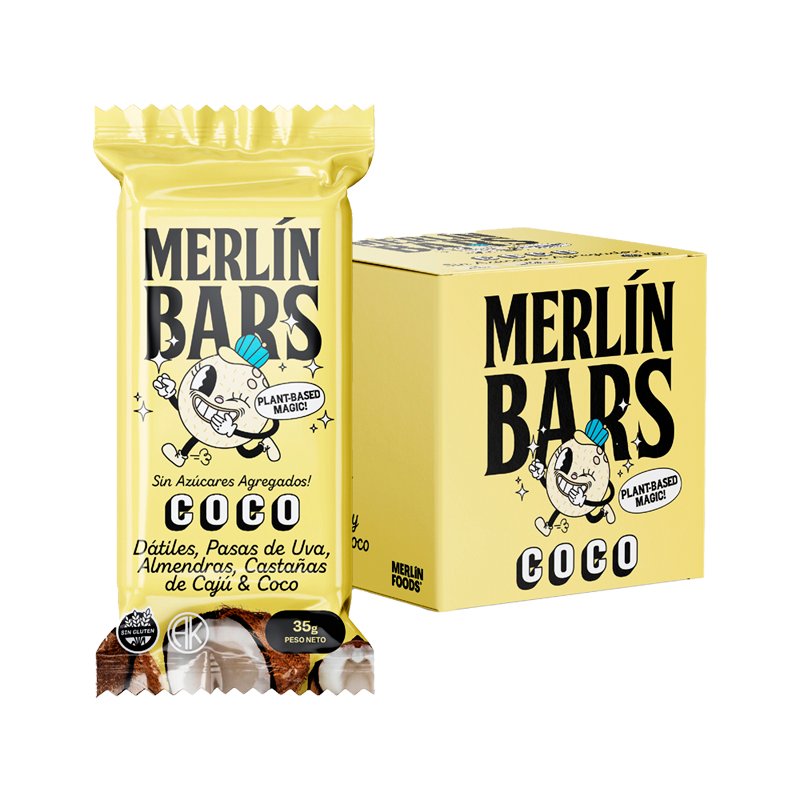 barras sabor coco de la marca Merlin. Kosher, veganas, sin tacc, sin azúcar agregada, sin conservantes ni lactosa caja x 14 unid de 35g