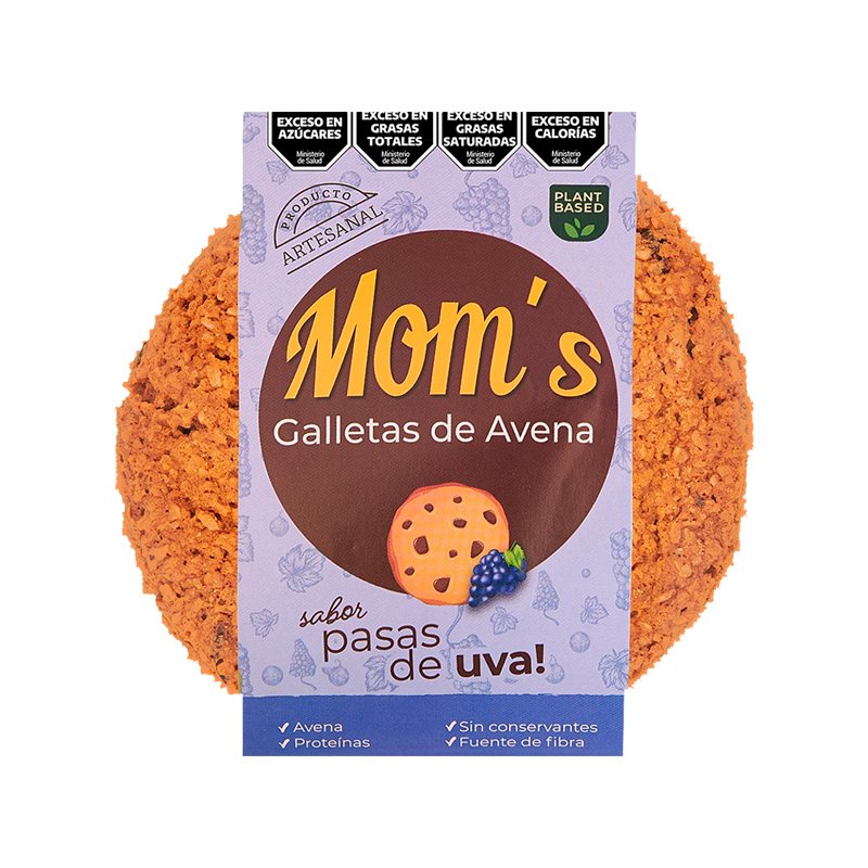 MOM’s. galleta de avena sabor pasas de uva con avena, harina de trigo enriquecida, semillas de chía y pasas de uva tiernas, apta para dietas veganas pesa 60 gramos. pack x 10 unidades