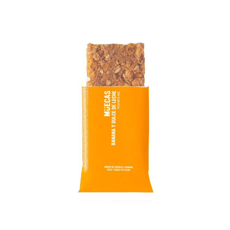 contiene 16 unidades de barritas de cereal de la marca Muecas sabor banana + dulce de leche, con ingredientes reales como avena, banana deshidratada, maní y coco rallado. Con 45 g por unidad.