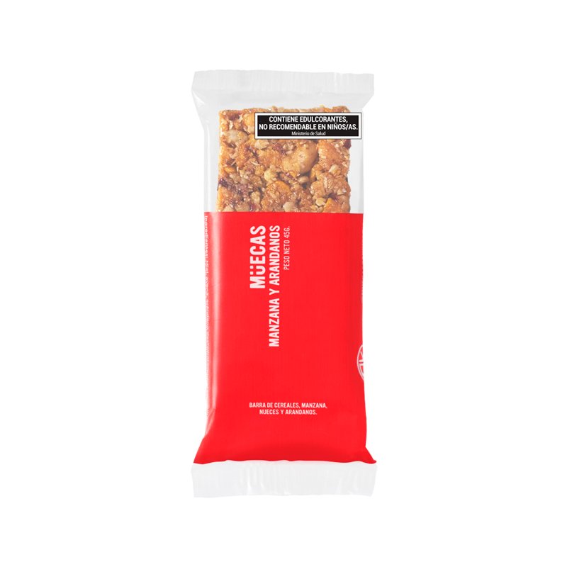 pack de 16 unidades de la marca Muecas sabor manzana y arándanos. Elaboradas con ingredientes reales como avena, manzana deshidratada, arándanos, nueces; son aptas para veganos, sin lactosa, fuente de fibra y bajas en sodio. De 45 g c/u