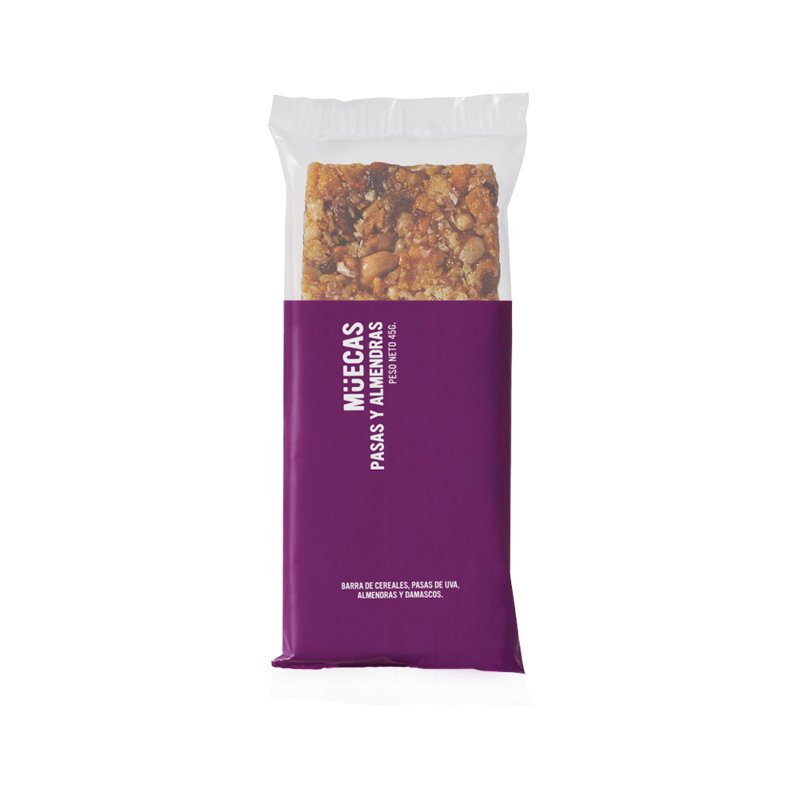 caja de 16 unidades de la marca Muecas ofrece barritas de cereal elaboradas con pasas de uva, almendras, avena y semillas, en presentación de 45 g por unidad. Aptas para dietas sin gluten sin tacc de 45g c/u