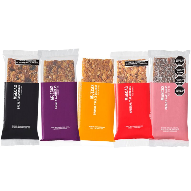 caja de 16 unidades de la marca Muecas, incluye una variedad de sabores de barritas de cereales (banana y dulce de leche, cacao y avellanas, manzana y arándanos, pasas y almendras, pasas arandanos) de 45g c/u