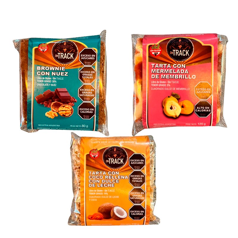 caja surtida de 12 unidades de los deliciosos cuadrados On Track, que incluye brownie de chocolate con nuez, coco con dulce de leche y frola de membrillo. Sin tacc de 80 / 120g c/u según variedad