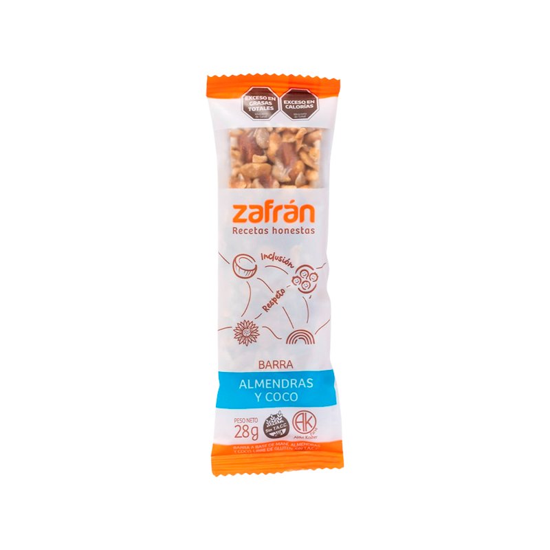 barra Zafrán saludable y sabrosa con maní tostado sin sal, almendras peladas y coco en escamas,sin tacc y kosher y sin aditivos de 28g x12 unidades