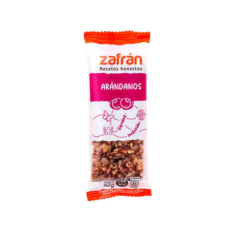 barra Zafrán sabor arándanos y almendras ingredientes maní tostado sin sal, almendras, arándanos deshidratados, arroz yamani integral inflado y semillas de sésamo. kosher sin tacc de 28g x 12 unidades