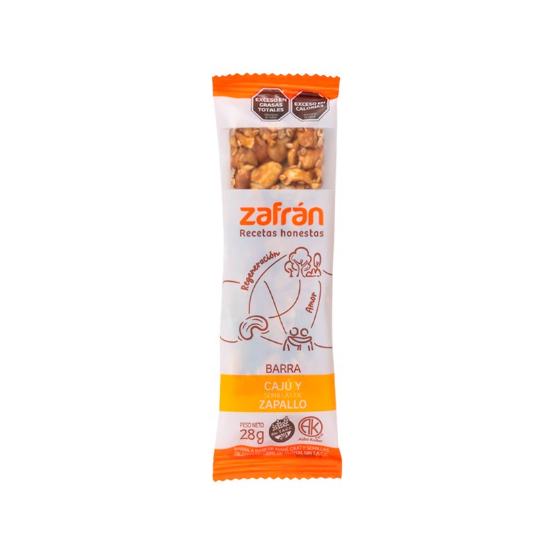 Zafrán sabor cajú y semillas de zapallo combina maní tostado sin sal, almendras, castañas de cajú, semillas de zapallo, azúcar mascabo, miel y semillas de sésamo integral. sin tacc ni conservantes artificiales. de 28 g caja x 12 unidades